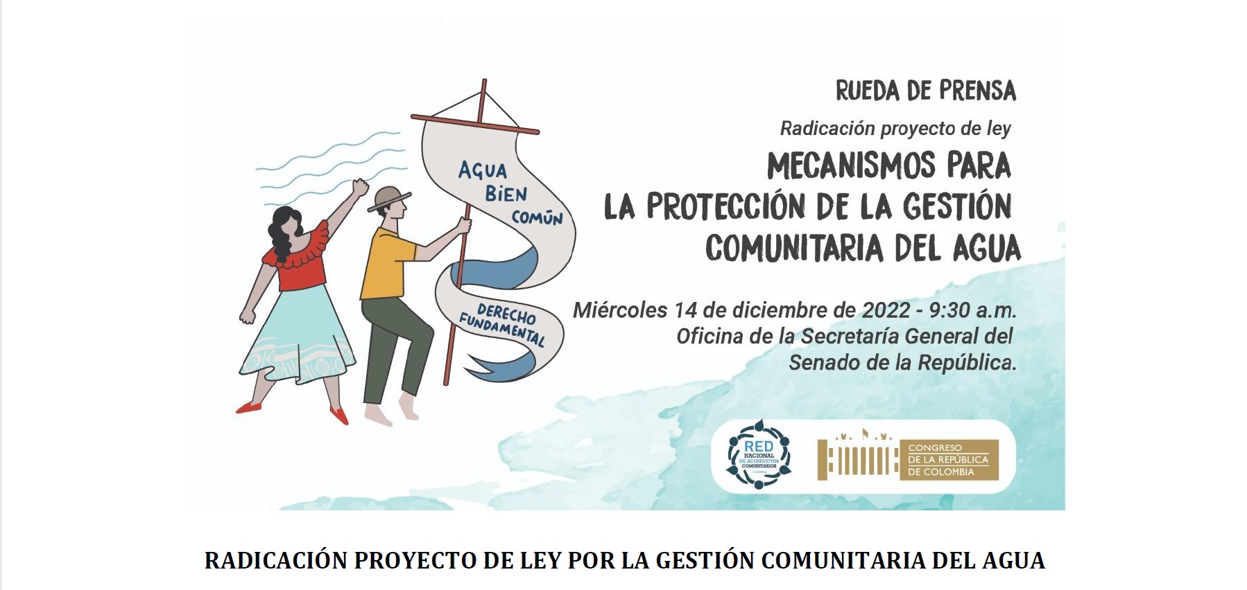 El miércoles 14 de diciembre de 2022 a las 9:30 a.m. la Red Nacional de Acueductos Comunitarios de Colombia radicará su proyecto de ley “Por medio de la cual se garantizan los mecanismos de protección del derecho a la gestión comunitaria del agua, los aspectos ambientales relacionados y se establece un marco jurídico para las relaciones de las Comunidades Organizadas para la Gestión Comunitaria del Agua con el Estado.